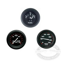 Teleflex Amega series gauges have a domed, black bezel with white and red graphics on their black dial background. Bezels follow the curve of the lens, eliminating water trapping inside.